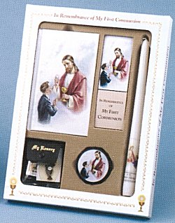 Contains a Sacred Heart Edition First Mass Book, deluxe chain rosary in a two-piece twist case, laminated scapular, enamel pin, taper candle, and laminated bookmark.