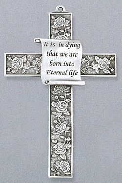 This attractive Memorial Cross is made of fine Pewter, measures about 5" tall and has the prayer: "It is in dying that we are born into Eternal life".