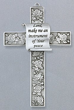 This attractive Memorial Cross is made of fine Pewter, measures about 5" tall and has the prayer: " Lord, make me an instrument of Your peace".