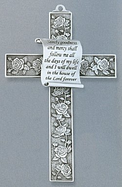 This attractive Memorial Cross is made of fine Pewter, measures about 5" tall and has the prayer: "Surely goodness and mercy shall follow me all the days of my life and I will dwell in the house of the Lord forever".