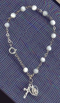 This attractive Rosary Bracelet includes 5mm Mother of Pearl Beads and Sterling Cross and Medal. It measures about 7 3/8" long.