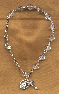This attractive Rosary Bracelet includes 6mm Aurora Borealis Cut Cyrstal Beads and Pewter Cross and Medal. It measures about 7 3/8" long.