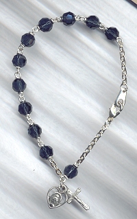This attractive Rosary Bracelet includes 6mm Blue Montana Cut Cyrstal Beads and Pewter Cross and Medal. It measures about 7 3/8" long.