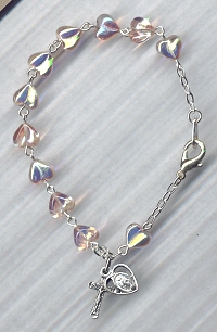 This attractive Rosary Bracelet includes 8mm Rose Heart Beads and Pewter Cross and Medal. It measures about 7 3/8" long.